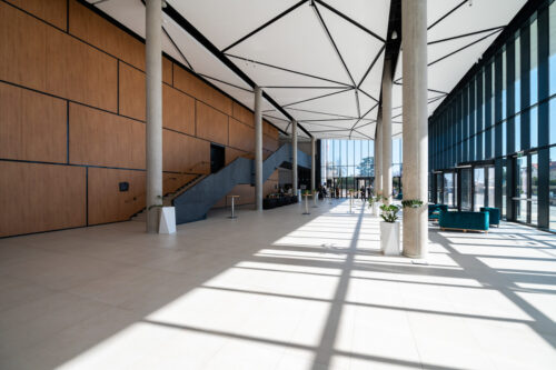 Üvegfalaival, látványos mészkőburkolatával és könnyed eleganciájával illeszkedik a város szerkezetébe. Az impozáns előcsarnoki kiállítótér és a plenáris terem színházként is használható, de több szekcióterem is támogatja az itteni programokat, amelyek össze is nyithatók egymással. Technikai felszereltségének korszerűsége és a terek funkcionális rugalmassága kiemelkedő.